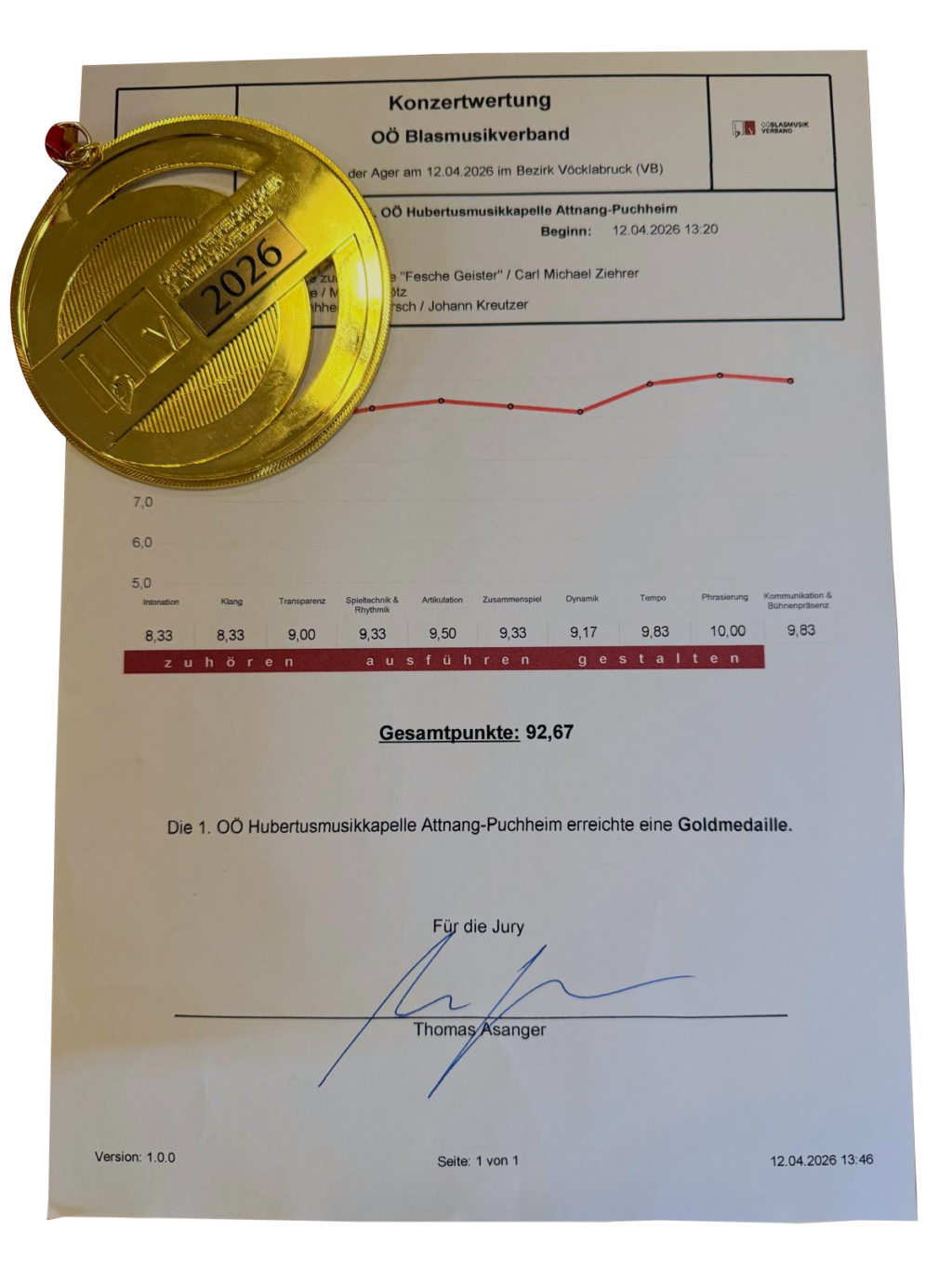 Mit 92,67 Punkten in der Stufe B erspielten wir eine Goldmedaille und stellten damit unsere musikalische Qualität eindrucksvoll unter Beweis.