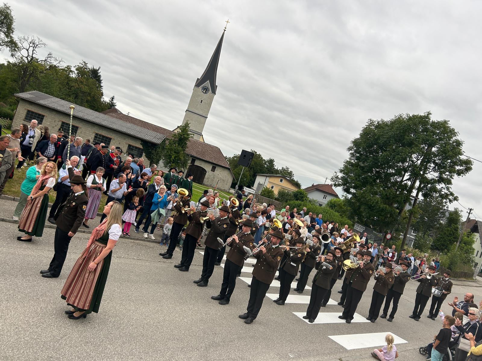 Trotz bereits am Vormittag stechender Sonne ließen sich weder die Feiernden noch die Geistlichen davon abhalten, den Festtag gebührend zu begehen. Pater Fritz zelebrierte gemeinsam mit unserem Diakon Hannes und stolzen 21 Ministrantinnen und Ministranten einen eindrucksvollen und feierlichen Gottesdienst, der Dank der Unterstützung von den Religionslehrerinnen und zahlreichen Kindern liebevoll und musikalisch gestaltet wurde – auch wir als Musikverein durften zur feierlichen Umrahmung beitragen.